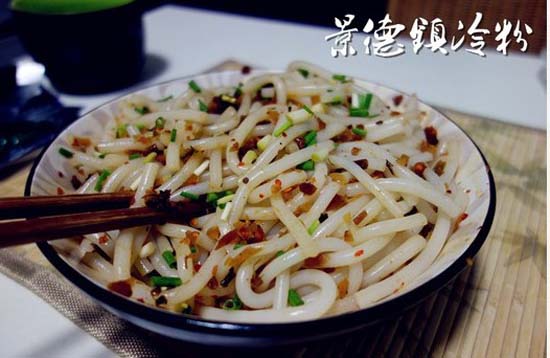 这是景德镇的一绝--冷粉。看到没有,有没有觉得这个粉丝有点不一样?对了就是不一样。冷粉虽然很多地方都有,但是景德镇用的冷粉不一样。粉条比较粗,大概半径有0.5厘米左右(相当于普通筷子的粗细)。其制作简单,风味独特,物美价廉,备受当地人的喜爱。出趟远门,或者在外工作,亦或在外求学的本地人,返景以后,大多会一尝以饱口福。